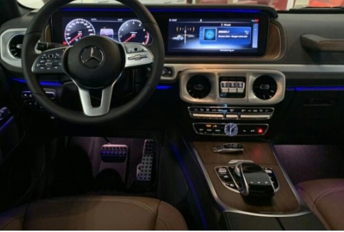 2019款奔驰G500内饰部分相比上代车型有了明显改变,几乎是天翻地覆的变化。真皮方向盘采用了金属材质按键,手感非常的不错,另外它还配备了换挡拨片,不仅提高了驾驶便利性,而且越野乐趣也有了增加。排挡杆跟家族其他车型一样,终于变成了怀档模式。双12.3英寸显示屏是整个中控台上最为抢眼的设计之一,它们的出现,极大的提高了内饰科技感,并且和银色材质搭配和谐。内饰的美设计优秀,和前几代相比,可以说是从土豪风往时尚圈成功转型。中控台中央还配备了三把差速锁,由此可见他的越野能力和脱困能力都很有保障。柏林之声音响出现在了车内,车辆的不同位置都安装有银色扬声器,带来了很有质感的立体声效果