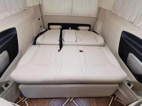 2019奔驰新威霆改装商务车,升级为电动侧滑门,映入视野的便是客舱豪华独立航空座椅,具备加热、通风、气动按摩、电动调度的靠背、腿托、头枕,前后电动调度,左右电动调度,一键式弹性腿托功用,180度旋转等功能。全车隔音隔热处置,内壁大面积的麂皮绒包覆,高光泽钢琴木漆件提升内饰的豪华品质,前后通舱设计让交流顺畅,既能商务接待,也可以作为家庭保姆车。