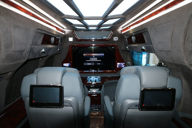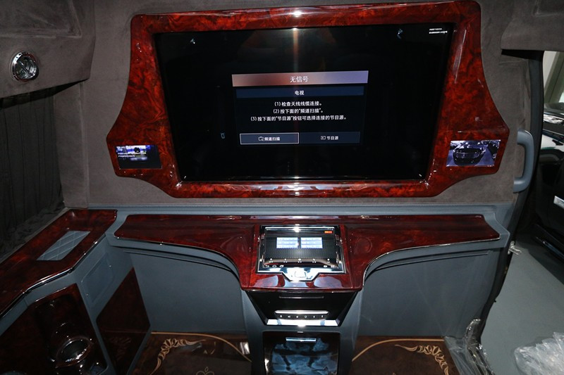 GMC商务之星前后商务隔断,保证了后舱的隐私,吧台变身为多功能中控台,搭载有DVD等系统,可升降的大尺寸电视为车内增加了娱乐活动。并且坐车无聊时,可以看看电影。