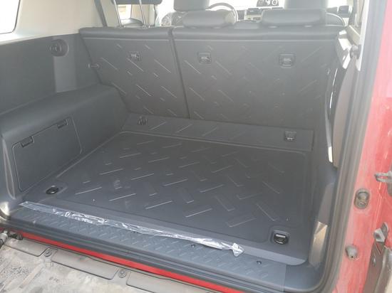 丰田FJ酷路泽在尾部的保险杠上设置了 深色的踏板。仪表板采用简单而有力的直线条,粗壮的水平线条和垂直线条相交,形成了平面与弧线融合的美感立体效果,给人一种时尚而粗犷的感觉。
