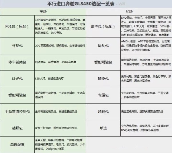 那么新车配置该如何选择呢?首先平行进口GLS450分两个版本 美版、加版 其中美版的配置多元化,选择性多 性价比高。加版起步配置就为高配相当于美规的小满, 如果追求配置就可以直接考虑加版车型。 配置如下图