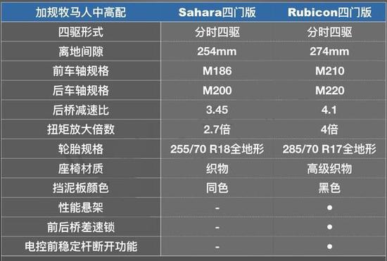 除此之外,加规还拥有低配型号,所以价格门槛也更低:两门Sport软顶版报价39万元,而四门Sport S硬顶版报价42万元起。这两个型号跟撒哈拉之间的标准配置差别,可以看这个表: