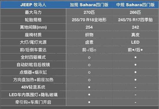 平行进口版新牧马人,目前只有加拿大版车源,跟中规版一样,加版目前也有6个车源型号在售,但是,双方只有3个型号能应对上。