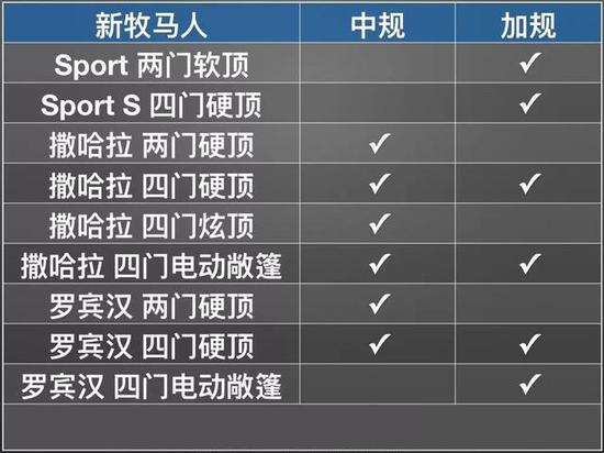 加规比中规多了两个低配型号:两门Sport软顶版,以及四门Sport S硬顶版,中规只引进了撒哈拉和罗宾汉,并没有引进低配的Sport和Sport S。
