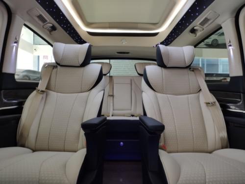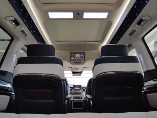 奔驰V级加完高顶后,车顶空间更大,个子高的人也可轻松乘坐,而且不会感觉到压抑感。车内主色调用棕色和白色为主,配上可变换颜色的顶灯,营造出一个私密的休息空间。
