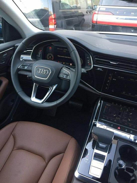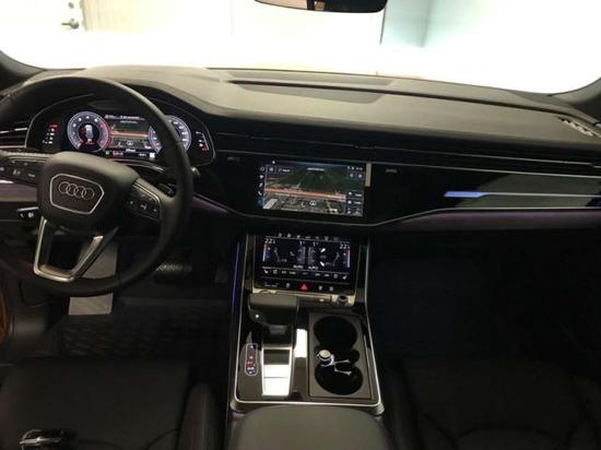 车厢内部,会感觉奥迪Q8和全新A8 (配置|询价)的设计高度雷同。奥迪全新家族化设计,科技感十足的虚拟驾驶舱氛围,同样的三块大屏,横向贯穿的前排空调出风口。中控台采用大面积的真皮包覆,且向驾驶员一侧倾斜,形成以驾驶员为中心的驾驶舱。整个中控采用了全触屏来对车辆进行操控,没有一个实体按键,对技术要求极高,非常的高大上。