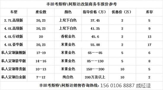 丰田考斯特改装商务车从座椅的设计上来说,丰田考斯特商务车的内饰座椅数量可以有10座11座12座13座14座15座16座17座18座19座20座21座22座23座这些不同的设计方案,同时丰田考斯特改装商务车还可以打造设计成移动房车或者KTV形式的移动娱乐场所。丰田考斯特不同的设计方案根据不同的需求作用而设计,每一款的设计都能突出丰田考斯特改装商务车的舒适贴心。
