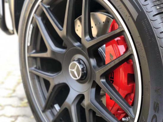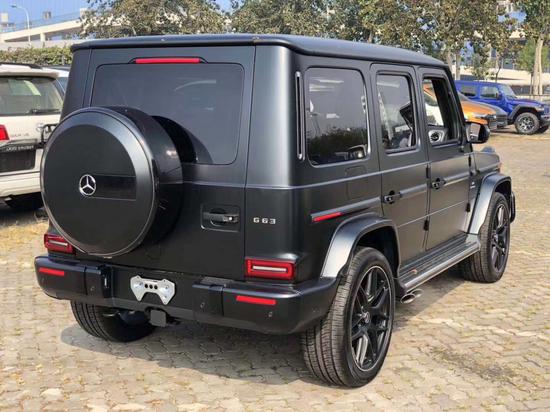 奔驰G63进气格栅配三叉星,四支大口径排气管从车身两侧后轮前部的侧裙处探出,再配以AMG传统风格的大尺寸合金轮毂。