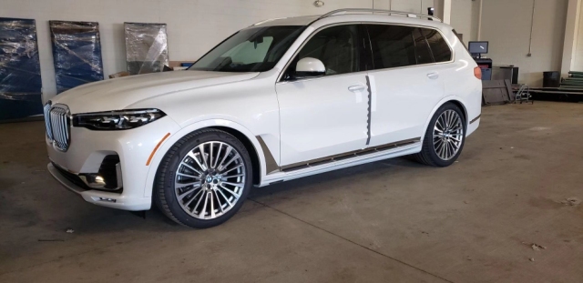 19款宝马X7侧面采用了与7系 (配置|询价)相同的“L型”镀铬装饰,一条贯穿车侧的腰线将尾灯也融入其中。车尾方面,镀铬条横贯至尾灯内部,以及下方的双边共两出式平行四边形镀铬排气口,都在展现它身为旗舰车型的霸气元素,