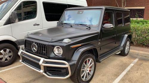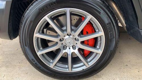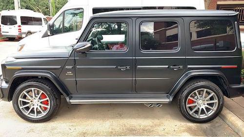 奔驰G63进气格栅配三叉星,四支大口径排气管从车身两侧后轮前部的侧裙处探出,再配以AMG传统风格的大尺寸合金轮毂。