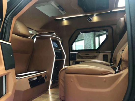 后舱采用了豪华商务车布局,前后舱也可设有隔屏,配以22寸超薄显示器,在最大程度上保证了后舱乘客的私密性的同时又可以在旅途中享受影音快乐;舒适独立的多功能电动真皮座椅,让您置身其中会忘记自己身处外观如战车般的乘坐舱内。