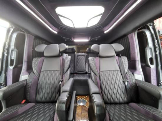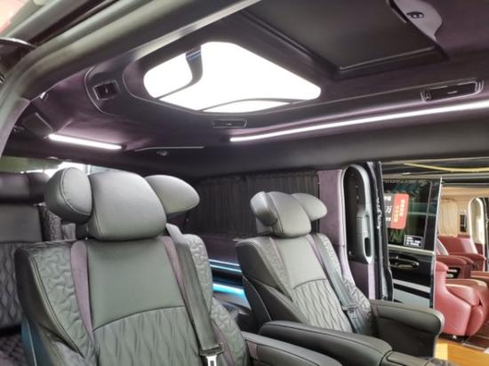 该款车型的设计赋予了该车绝佳的视觉感与空间感,顶部大面积使用几皮绒包覆,视觉上不再像皮革包覆带来的冰冷感受。顶部灯光的造型设计非常简约大气,摒弃了传统改装商务车花花绿绿的灯光,而使用冷色调的白色光源,使该车的整体格调提升了N个档次,中央顶部的灯组也可以根据乘客自己对灯光的明亮度,进行一个手动的调节,人性化设计无处不在。在顶部,也有该公司独特的设计理念,第3排顶部独有BOSE顶级音响扬声器设计与空调出风口的设计,表现出该款车的不凡与独特,为乘客带去震撼的视听感受。伟巴斯特的天窗配备也是该类车型中的一大亮点,让喜欢在车上吸烟的乘客空气流通的质量保证。