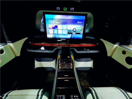 路虎皇家一号加长版配有做工非常考究的吧台,让您置身车内尽可享受舒适奢华的贵宾式待遇。全景天窗下,隔屏吧台搭载三星32寸液晶升降电视,MERIDIAN英国之宝环绕音响,秉承着高贵与简洁的设计宗旨,清晰重现各种声音,其品质可见出类拔萃。左右下方各9.7寸液晶显示功能屏,让视觉听觉与触控发挥到极致。