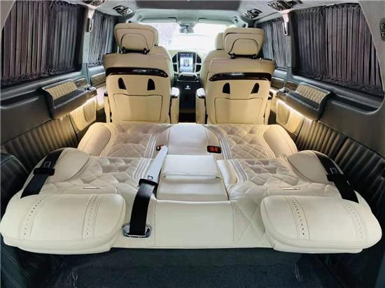 后排三联排座椅,中间隐藏着中央扶手箱,内置有全彩触控屏,使得后排贵宾也能自如的操控车上的功能。一键放平靠背,车舱内又能惊现出一张双人床来。