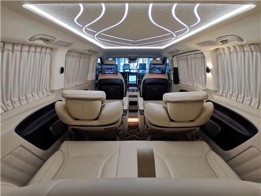 奔驰威霆改装商务车 商务接待内饰太奢华了,首先,在座椅部分,宽大厚软的真皮座椅,具备多向调节与按摩等功能更佳;毕竟MPV不是小巴士,不必追求座位数量;MPV改装应追求乘坐体验,为达到此目的,换上一套大沙发也未尝不可。得益于MPV巨大的内部空间,改装内饰时自由度更高;玩家们可以毫无压力地在MPV的车厢里打造一个豪华包厢,让乘客在行驶过程中获得豪华体验。