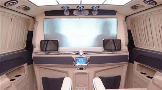 奔驰VS980采用隔断式吧台,,吧台中间镶嵌钟表,42寸雾化玻璃,隔断处后排娱乐,后舱独立空调系统,全车真皮包裹。整台车采用了前后无隔断的设计,隐私性稍差空间性更好,便于商务接待的同时兼顾家用,定制风格采用经典的迈巴赫元素,宽大的航空椅配上迈巴赫舒适头枕,坐在上面就想美美睡上一觉。无论出游还是商务会谈都十分凸显逼格儿。