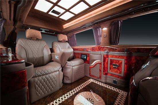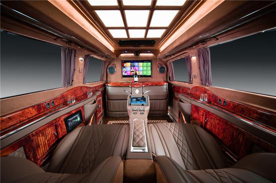 奔驰威霆钻系列全车采用隔断设计,实木吧台可电动收展成隐藏式秘书座椅,吧台于座椅完美结合,吧台中嵌英国进口游艇级钟表,座椅采取迈巴赫S (配置|询价)500反向座椅。影音娱乐系统,32寸超薄可升降液晶电视、日本健伍音响、蓝光DVD,以及电动办公娱乐桌板系统、12V可翻转热水壶、指纹识别保险柜、酒柜,对于商务谈判来说,这一切的配置都来得恰到好处。