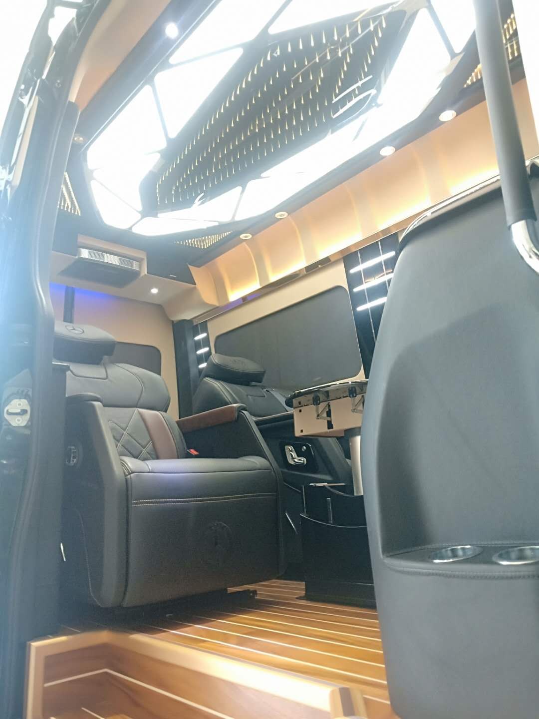 奔驰斯宾特房车的座椅格局也是与众不同,同样也是因为宽敞的车内空间。2驾驶座+2折叠秘书座椅+2航空按摩座椅+3连排沙发床,折叠秘书座椅和航空按摩座椅可以形成2对2的商务洽谈对座模式,可以满足总裁们的出行商务需求。