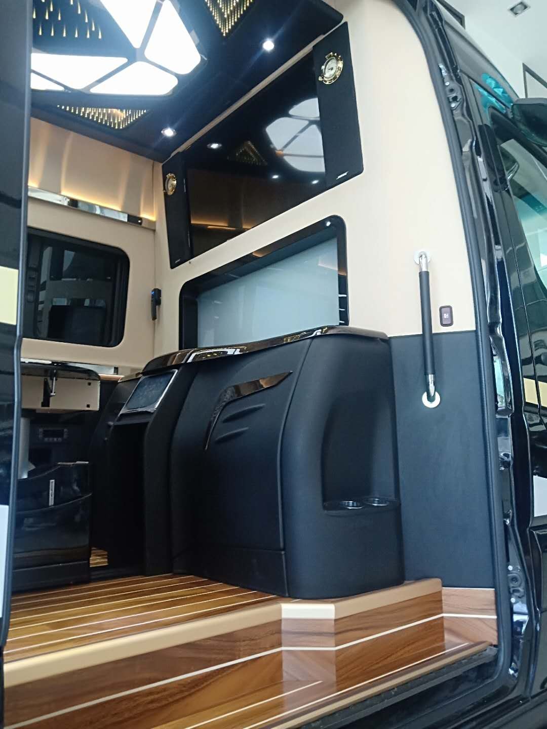 奔驰斯宾特房车内部空间采用全隔断前后舱分开的空间布局模式,隔断处奔驰斯宾特房车安装了大尺寸液晶卫星电视,即使在户外也能收到多频道的电视资源。结合车载小吧台上的一系列电子设备:DVD影碟机为您读取碟片精彩片段,Bose5.1环绕音响,环绕式影院音效更好地享受影片,前后舱对话系统连接驾驶舱与后舱的通话。