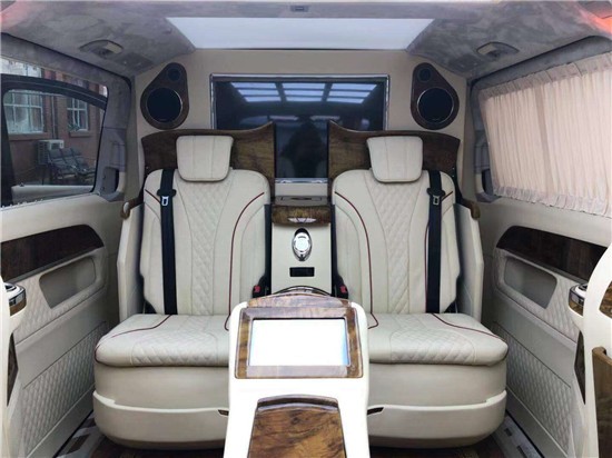 这款奔驰V260的贵宾舱采用的是两两对坐的商务洽谈格局设计,在大尺寸的液晶电视下方,奔驰V260配置了两个可折叠的秘书座椅,可一键电动展开。在两张秘书座椅的中间,是一个小型车内吧台,内置胶囊式咖啡机和一个折叠小桌台,最大限度的利用车内空间,折叠小桌台也可以给车内的商务人士提供一个处理文件以及与客户洽谈的平台。(更多资讯文章底部李经理24小时咨询热线)