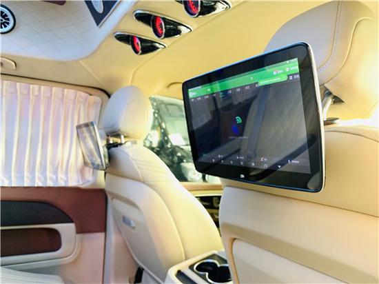 迈巴赫VST680高顶无隔断商务车主副驾驶后侧安装有两个号称娱乐之王的后排娱乐电脑,可供您办公及长途行驶时娱乐,主副座椅还配有两个隐藏式手动小桌板,可承重5KG。无隔断设计非常适合家庭用车,前后舱沟通方便异常。