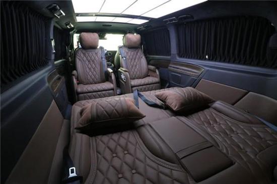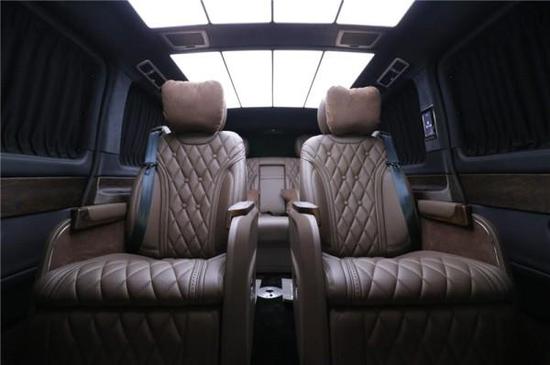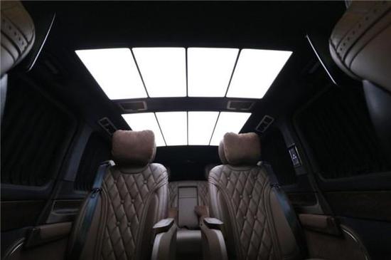 车顶采用八块LED的长方形顶灯设计,荧光灯下的亮度刚刚好,还有很人性化的弧形顶。奔驰VS680无隔断的设计,使得车内的空间视野最大化,不会有压抑感,也方便了车内的沟通交流。