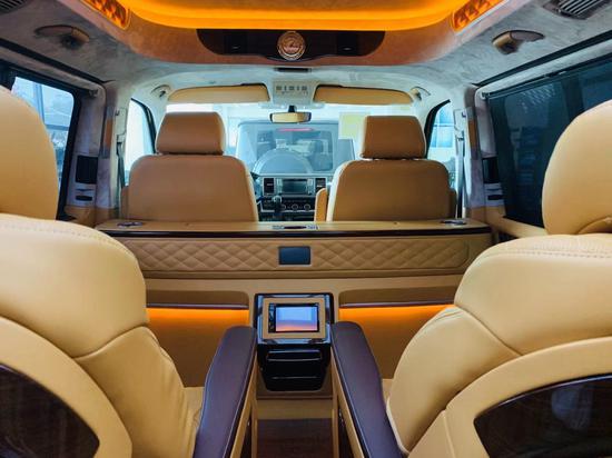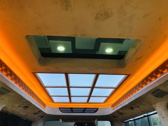 后舱影音娱乐系统都集中在隔断处,隔断全貌:隔断上方配备超大屏液晶电视,支持手机投屏。搭配两侧高级环绕音响系统可以让后舱乘员畅享影音盛宴。下方的触摸控制屏,可以十分简便的对电视及灯光等进行一键控制。在T型吧台底端配备英得尔冰箱,英得尔源于意大利。专业研发、生产、销售压缩机车载冰箱。产品选用世界著名的思科普(原“丹佛斯”)BD微型车载压缩机作为核心配件,产品被广泛应用于汽车、游艇、房车、卡车、商务、医疗等多个领域。后舱地板采用游艇木级柚木地板,大大的提升了整车的档次。不仅保留了原始实木地板的纹路以及舒适感,更加稳定耐磨能够防潮防虫,还便于清洁护理。值得一提的是车顶采用宫格式顶灯设计,具有古典韵味和艺术气息,格调优雅美观大方。打开灯光,光线温暖柔和能够提供足够的光线供乘客阅读,而不会令乘客产生眩目感。