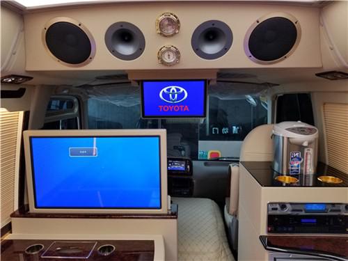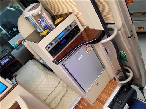 丰田考斯特12座改装商务车在内饰的其他的设备上,也充分体现了改装的独特之处。丰田考斯特改装商务车12座内饰的灯光,地毯,窗帘,办公桌,车载冰箱,雨伞柜,酒柜,隔断,迎宾标志,车内驾驶席的半桃木装饰既能够提高丰田考斯特12座改装商务车内饰的美观。