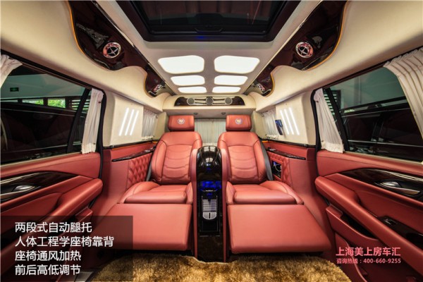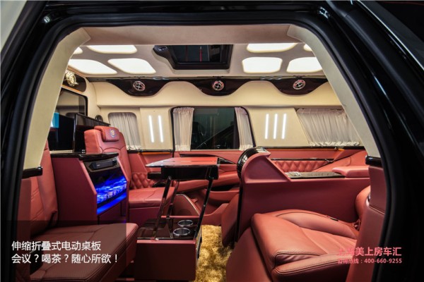 内部的布局也是奢华与科技并存,得以于6米的车身,内部空间也是十分的充足,前排搭配2个电动折叠座椅,座椅收起后会跟多功能实木吧台融为一体,形成更大的豪华吧台。内部配备了真皮桃木内饰、高级地毯。32寸三星高清电视作为可升降分隔屏,方便与前方乘客沟通,如果麻烦,座椅旁边也有对讲电话,保护后排的隐私。