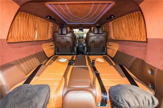 奔驰V250七座车型的第三排沙发,支持一键放平或者收起,随时为您的长途出行打造足够宽敞舒适的卧铺,简约时尚的氛围灯与豪华柚木地板交相辉映,是对精致移动生活的皮质追求!