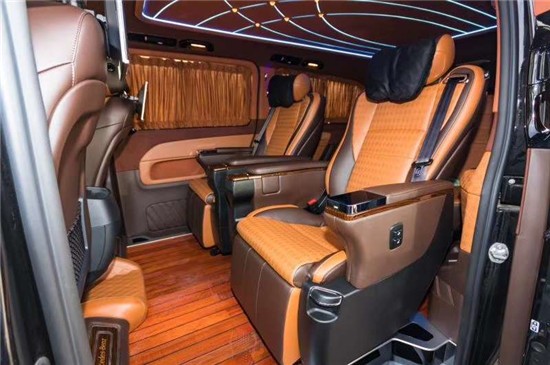 非凡的内饰展现在每一个细节,无隔断式设计让内部空间感更加宽阔。中央的首长席座椅多功多样,包括有多向电动调节、腿托、前后旋转等。车顶采用简洁化的设计,采用Alcantara包裹高档感十足。两张座椅皮质与填充物方面都以舒适为主。上面的缝线也相当细腻,首长席折叠电脑桌闪耀。