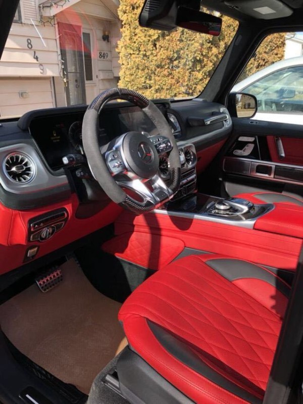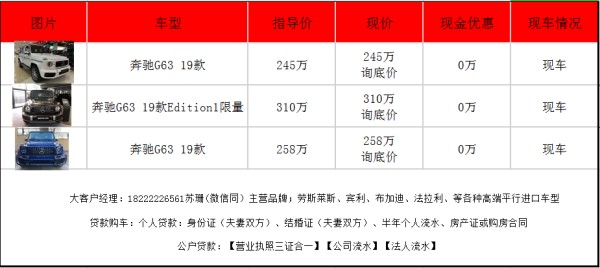 19款加版奔驰G63 (配置|询价)AMG 颜色 外观:黑色 内饰:红色 配置: AMG变速TCT 9速变速箱,前座椅记忆,前排座椅加热,滑动玻璃天窗,三区气候控制,空气净化,电热挡风玻璃,加热方向盘,AMGNappa真皮性能方向盘,21轮毂 AMG 暗夜包 Burmester环绕声系统,苹CarPlay,64色LED环境照明,自动启动/停止,AMG性能排气系统,AMG高性能制动系统,红色的刹车卡钳,AMG控制自适应阻尼架,主动车道保持辅助,盲点辅助,主动刹车辅助,交通标志辅助,主动停车辅助,360度环影,主动多光束LED照明系统,LED日间运行灯 单选: 菱形格座椅 翻毛皮顶 碳纤维内饰 碳纤维方向盘 反毛报价235-295万现车手续齐当天票