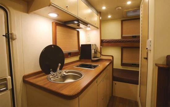 带淋浴防水卫生间;进口自带黑水箱式电动冲水马桶;一体式水龙头淋浴花洒;进口全自动水路,进口智能水泵,圆形重力加水口,外接20米加水管;换热式热水器;200L不锈钢净水箱,55L不锈钢灰水箱,28L马桶自带黑水箱;手动排污阀;净水箱、灰水箱电加热防冻装置。