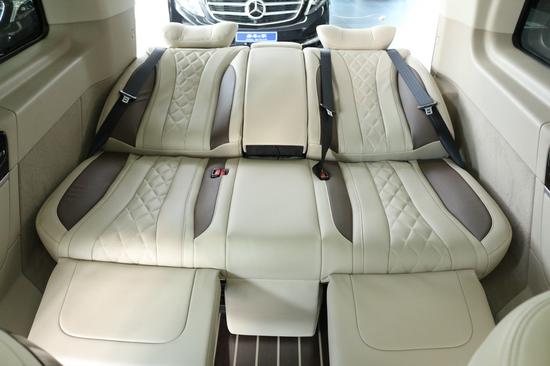 奔驰V260L七座改装商务车●全新按摩航空座椅、气动按摩、加热、通风、一键式回想座椅调度、腿拖调度、靠背前后调度,头枕升降,电动肩部支撑。●奢华沙发床加热、靠背调度、腿拖调度、半展平情况。●可拆卸式文娱活动桌●沙发床后背手动储物抽屉●四季适用透明环保地膜●经典镀络衣架 )限量版手工高光泽座椅扶手