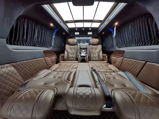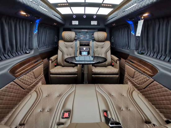 进口奔驰V260L改装商务车后排三座采用的是电动三连坐沙发座椅,支持电动一键平躺,座椅变大床只需要一秒。后舱为了照顾到没有像全隔断设计那样较好的私密性,V250设计了电动遮光窗帘,让整个空间能够不被外界轻易看到。