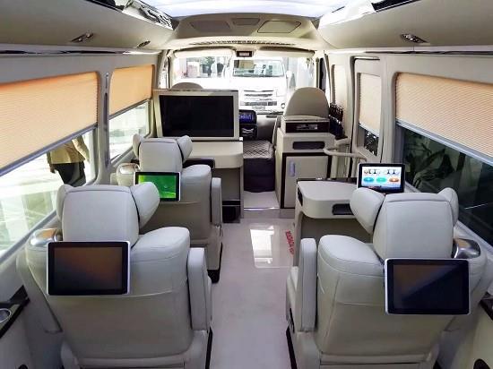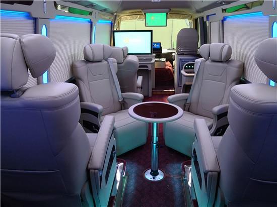 首长席航空座椅:高档首长座席由真皮航空座椅构成,根据人体工程学设计的弧度,使人体乘座更加舒适、贴切。让更贴合乘客的移动办公需求,让领导感受超乎寻常的尊贵感和舒适感13、侧壁更换蒙皮:侧壁更换意大利顶级真皮,手感舒适,侧壁菱形格的设计使整车层次分明立体感更强