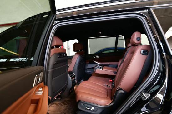 来到第二排,X7配备三段式星空全景天窗,前排座椅背部提供两块娱乐系统显示屏,后排独立空调下方还集成了储物格、双USB Type-C充电接口、12V电源以及娱乐设备,同时B柱也配有空调出风口。六座版车型第二排为两个独立座椅且带有电动调节功能,上方配备两个头枕,内侧配有座椅扶手,大幅提升了乘坐舒适性。