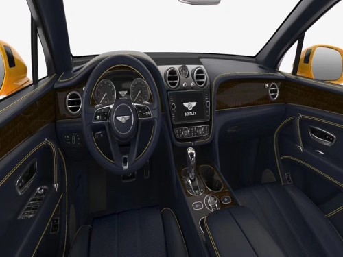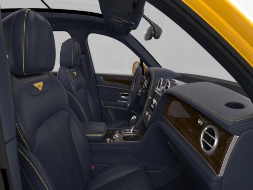 [选配]:特别定制外漆 座椅刺绣宾利徽章 座椅反衬色缝线 方向盘上的反衬色缝线 前座舒适座椅配置(5座配置) 同色车身 内部灯光调节 21寸两件式5幅铝合金黑漆钻石旋转轮毂