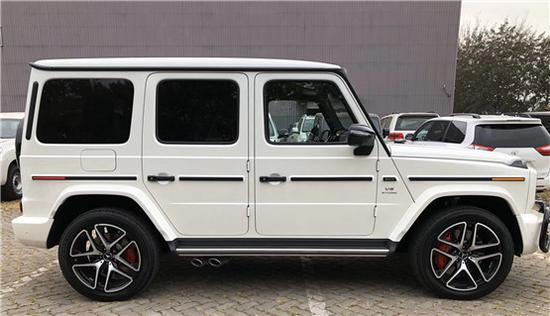 奔驰G63进气格栅配三叉星,四支大口径排气管从车身两侧后轮前部的侧裙处探出,再配以AMG传统风格的大尺寸合金轮毂。