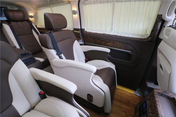 奔驰商务车v260新款的二排座椅还可进行360度的旋转,与第三排形成一个小型会议室。第三排的沙发座椅可支持放平,铺平之后,在上面休息一下,放松放松,整个功能性的实现还是相当人性化的。