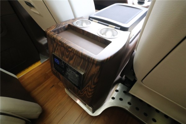奔驰商务车v260新款正副驾驶座的中央扶手被一台进口车载冰箱所替代,冰箱带还有冷冻功能,虽然它的容积不是很大,但在旅行中常用的食品及饮料的放置都是没有问题的,实用性也非常高。