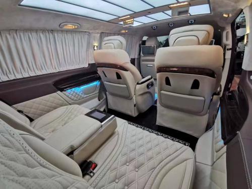 奔驰威霆改装商务车座椅设计得宽大舒适。奔驰威霆改装高顶无隔断7座商务车后排排两个,并带脚托、座椅记忆,电动升降头枕、座椅通风加热功能,享受堪称“头等舱”级别,设计体贴入微。更多的个人车主或是改装厂家,愿意将奔驰威霆打造成一款更加符合高端定位的豪华商务用车。