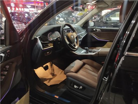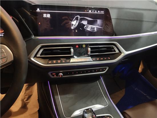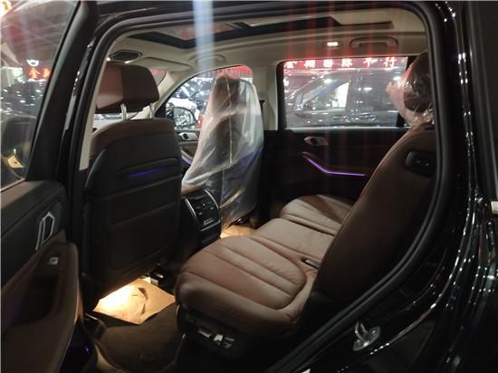 车身侧面上方配有黑色行李架,前翼子板下方为长条状空气导流槽,腰线较为低矮且呈上扬之势,选用21英寸双五辐式拼色轮毂。车尾造型方正,LED尾灯组与粗壮的银色饰条贯穿相连,采用上下分段式电动尾门,排气采用双边共四出式布局,保险杠下方两侧配有大尺寸镀铬尾喉装饰。 内饰部分,宝马X7采用最新家族式设计语言,使用大量真皮、木纹饰板进行包裹。配备12.3英寸带有注意力检测的全液晶仪表和12.3英寸悬浮式触控显示屏。空调出风口与温度显示屏、实体功能按键结合在同一区域,并使用银色装饰条进行点缀。下方盖板下方为带有加热、制冷功能的杯架,全新的水晶电子挡杆造型十分精致,进一步提升了车内的豪华氛围。
