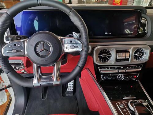 19款奔驰G63采用了奔驰最新的双屏幕式设计,全液晶仪表盘和中控台屏幕都达到12.3英寸。同时内饰质感和工艺都有了很大的进步。较之于现款车型,它的内饰发生了巨大的变化,融入了不少现款奔驰S级 (配置|询价)、E级的设计元素,从而变得更加豪华,而家族式的连屏设计则凸显了车内的科技感。当然了,经典的“三把锁”按键自然不会缺失,并且设置在中控台最为显眼的位置。