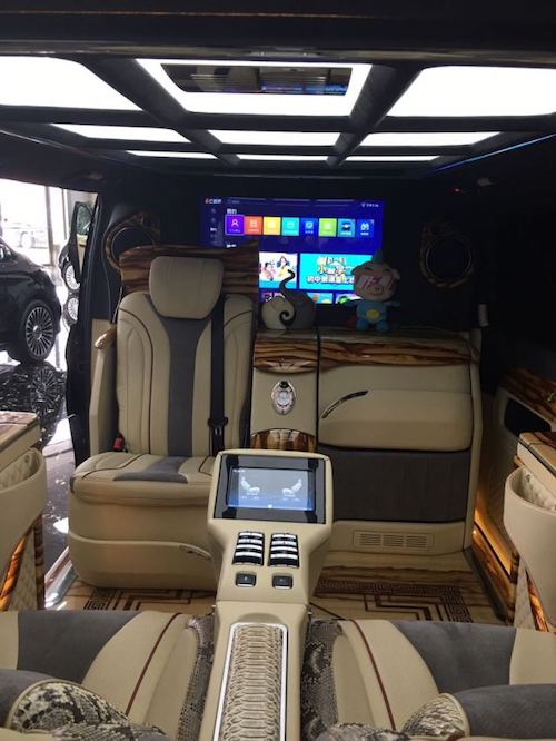 后仓高端液晶操控台,支持按键和触屏更有语音控制系统,更有逼格更有范儿了!整车的内饰配件都采用模具化生产,方便维修减轻车的重量,确保配件的供应,全车线束特约德国奔驰工厂线束专家研发设计,与改装车的私接乱改有所不同,使车辆更加安全,无后顾之忧!室内配有左右两侧电动隐藏办公桌板,iPad互联电脑、室内声控电动控制系统,电动窗帘、隐藏迷你保险柜、迈巴赫顶灯,所有饰条选用泰国珍稀树种虎斑檀木,工艺为实木纹贴皮,工艺精细,优雅高端大气,地板选用古巴影木全铝地板,不易变形坚固耐用,地板拼花为激光雕刻而成,极具现代奢华感,整个室内的设计已经提前超越了不止是五年,令国内外众多工厂都自叹不如!