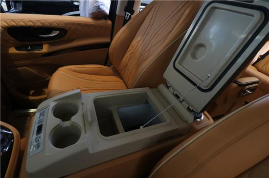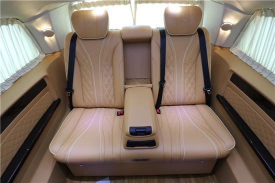 奔驰威霆改装七座后舱采用了7座无隔断的设计,迈巴赫顶棚+柚木地板都是标配。座椅采用了米色拼接工艺,座椅的材质也是目前市场上最上乘的nappa真皮。全隐私窗帘,顶部设有一台吸顶电视,可以播放DVD及U盘内容。两张航空座椅集成了按摩通风加热功能,也可以根据用户的需求进行360旋转。前排座椅背部还各配置了一个折叠式小桌板,方便放置物品或商务办公。