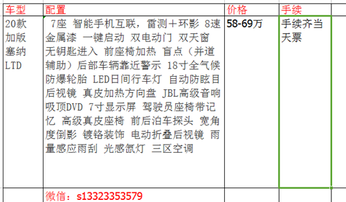 20款平行进口加版墨版丰田塞纳新车集大气于一身,不需要奢华来修饰,一样能得到广大消费者得青睐,简简单单方便使用,体现出商务风采的一面。新塞纳上挑的线条与修长的前大灯完美结合,中网和大灯的设计很有范儿,采用18寸的大轮毂,同时硬朗的腰线又让这部商务车充满了力量感。晶钻式大灯充满时尚感,线条炉火纯青的运用使得豪华感倍增,大面积的红色LED尾灯在夜间有不错的辨识度保证安全。