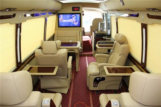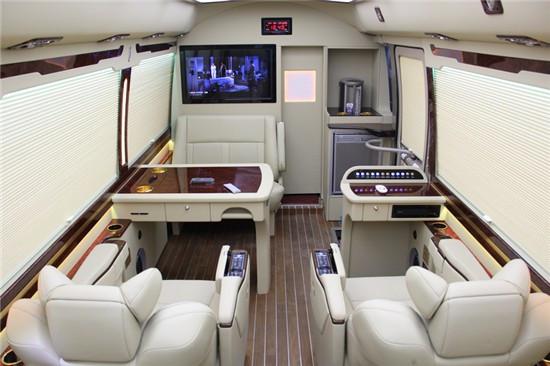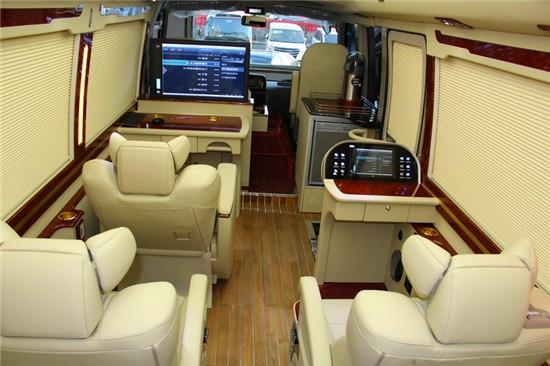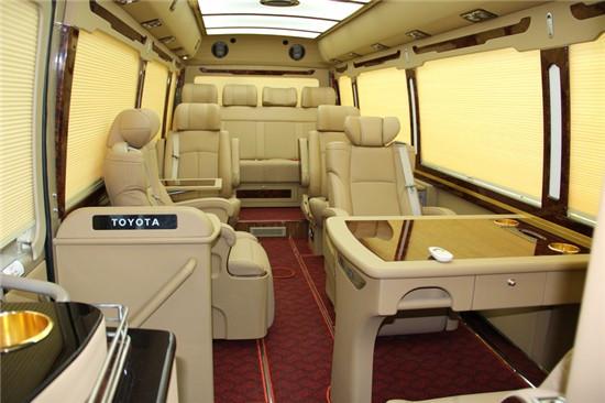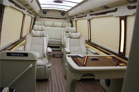 为了使领导在和下级部门经理或是商业合作伙伴一起时能够进行会议商谈、移动办公等,所以我们在12座丰田考斯特上还追求一个空间上的宽敞,在车厢内部所有的配件我们都追求一个高端大气,整个车内的基调都是使用的这个风格,使改装出来后,心怀宽阔的人都特别喜欢这款车。