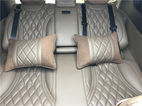 进入第三排我们深刻体验到这一点,第三排的座椅为贯通式设计,材质和舒适度与中排座椅一致,腿部和头部的空间可以用大的夸张来形容,创造出了绝等舒适的享受。在功能上后排座椅手枕中央配备了一小块儿液晶屏,可调控座椅的靠背和坐垫的前后移动,更为个性化的是整个后排座椅可以完全的放平,形成旅行床,可在上面短暂的休息,十分的惬意!