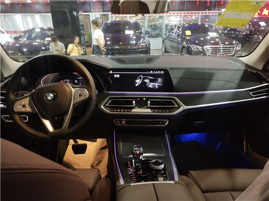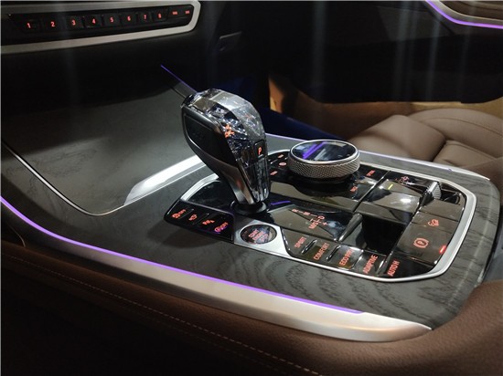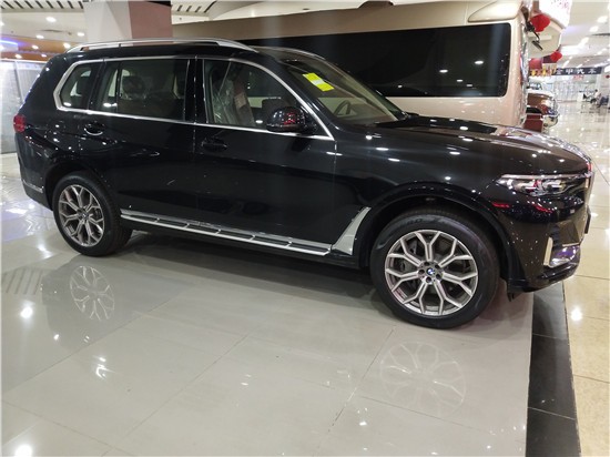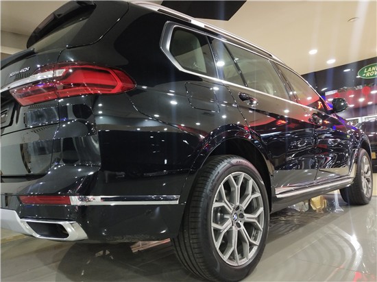 车身侧面上方配有黑色行李架,前翼子板下方为长条状空气导流槽,腰线较为低矮且呈上扬之势,选用21英寸双五辐式拼色轮毂。车尾造型方正,LED尾灯组与粗壮的银色饰条贯穿相连,采用上下分段式电动尾门,排气采用双边共四出式布局,保险杠下方两侧配有大尺寸镀铬尾喉装饰。 内饰部分,宝马X7采用最新家族式设计语言,使用大量真皮、木纹饰板进行包裹。配备12.3英寸带有注意力检测的全液晶仪表和12.3英寸悬浮式触控显示屏。空调出风口与温度显示屏、实体功能按键结合在同一区域,并使用银色装饰条进行点缀。下方盖板下方为带有加热、制冷功能的杯架,全新的水晶电子挡杆造型十分精致,进一步提升了车内的豪华氛围。